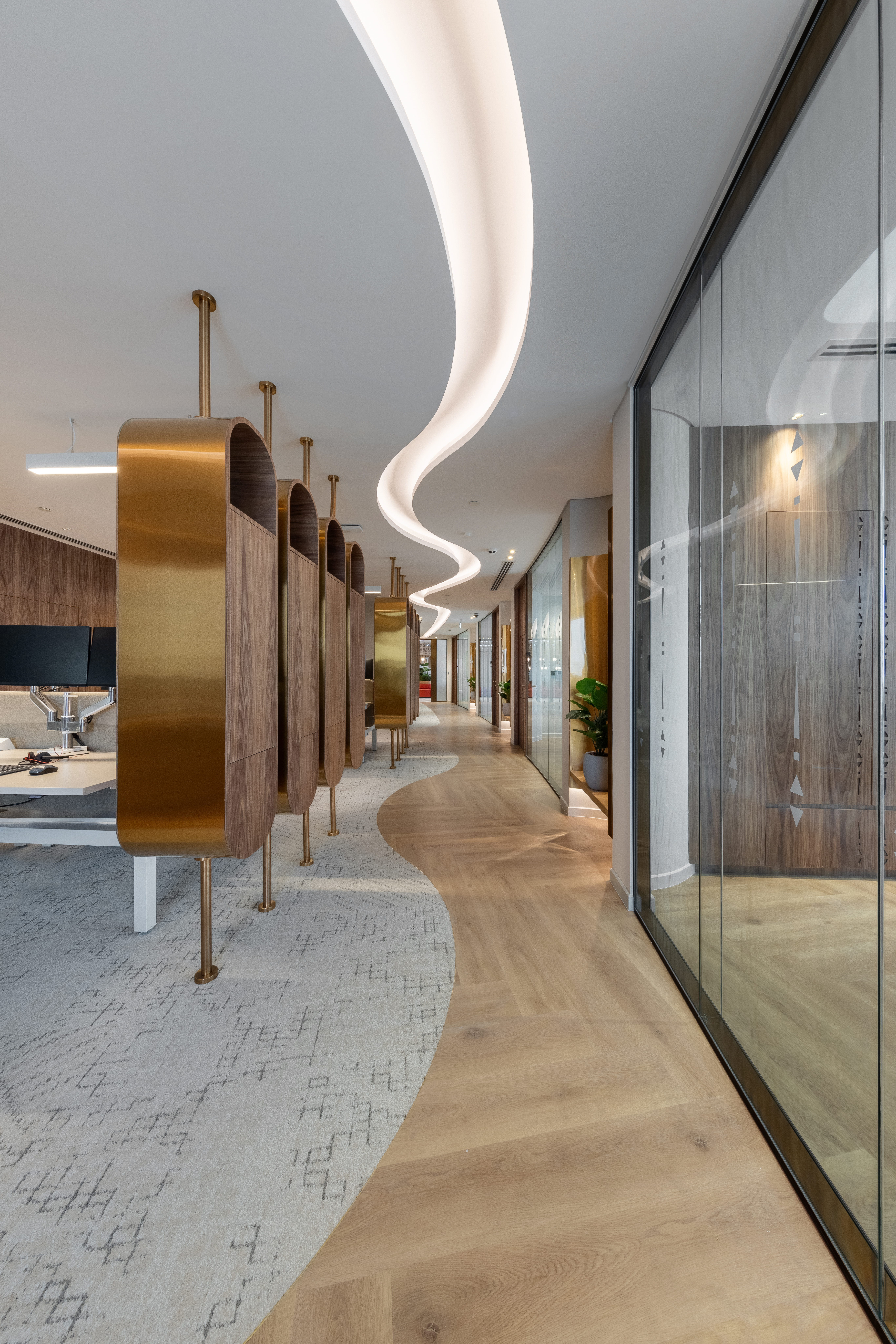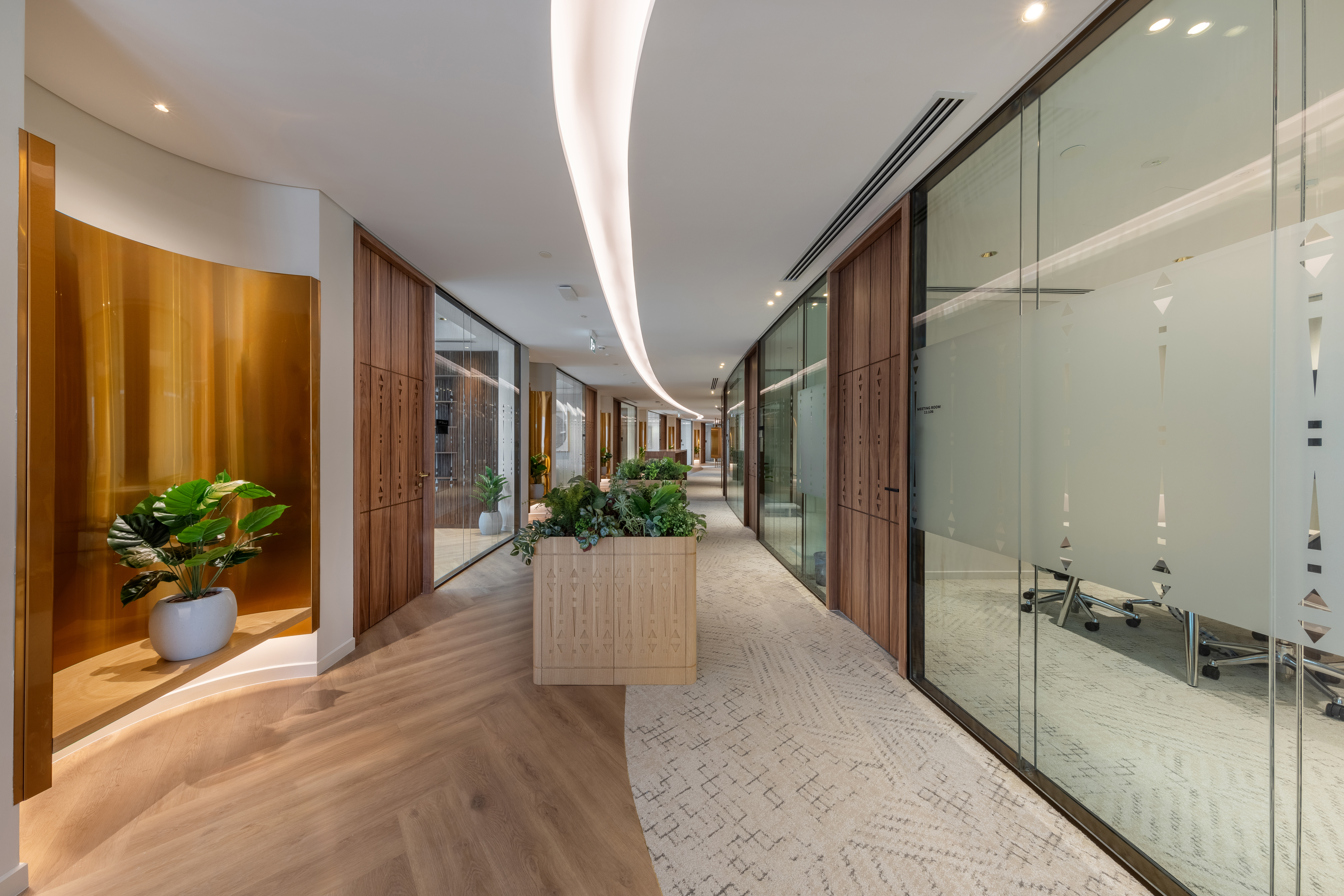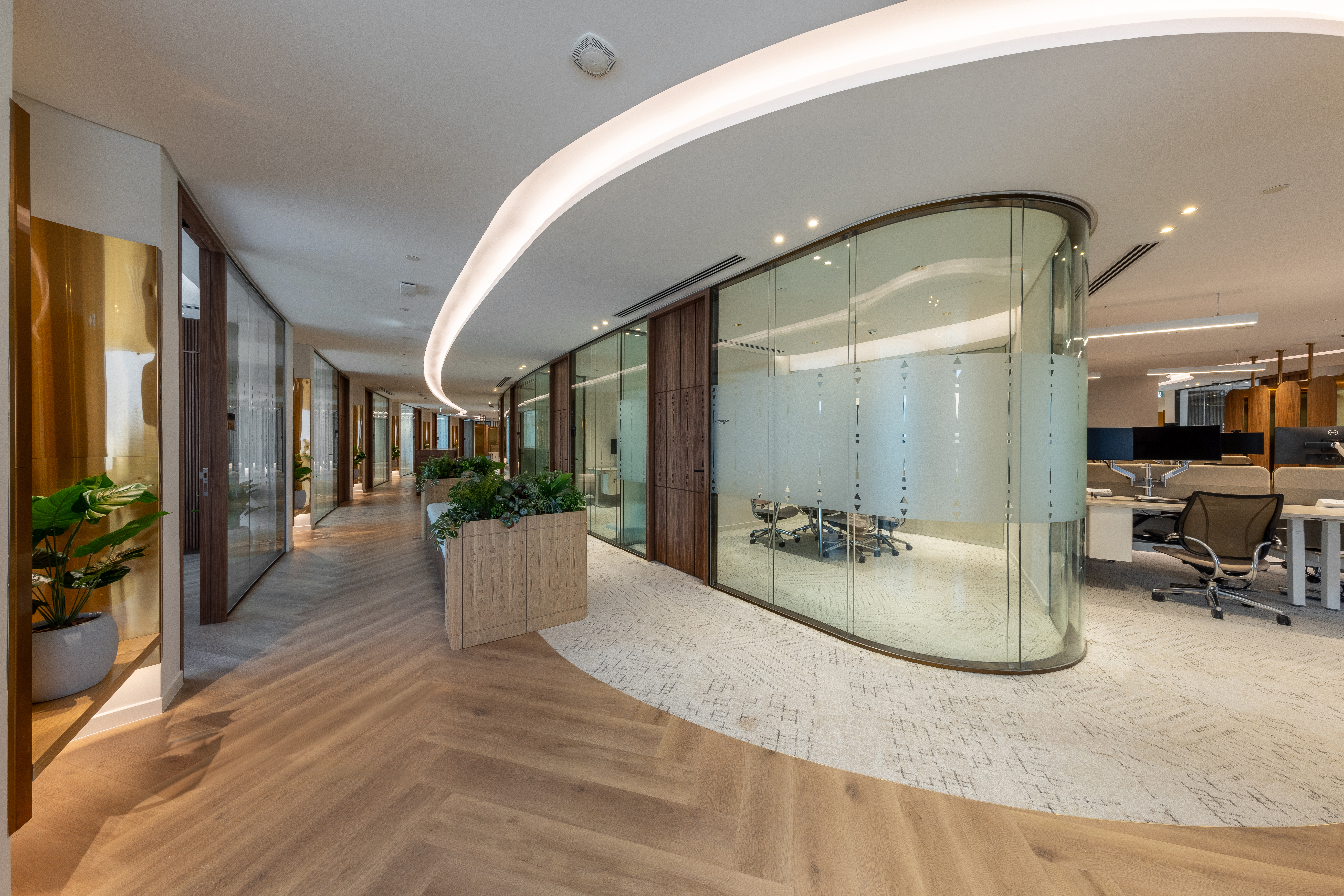 Fluid curved glass wall partitions that create a striking visual element to the space.